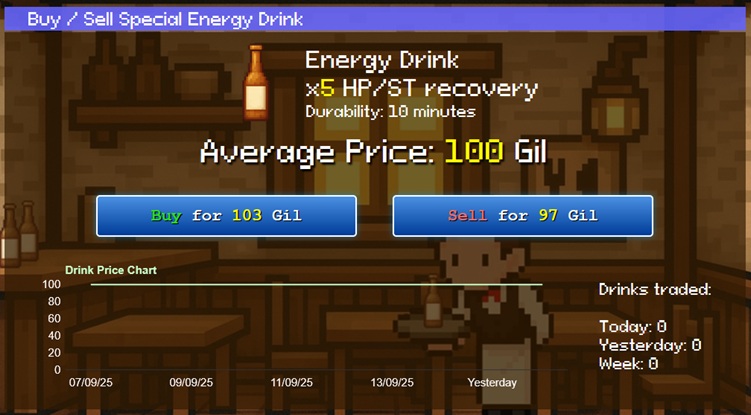![]() | Energy Drink will gives x5 HP/ST recovery speed for a limited time. In Dungeon Mode > Cafe, you can Buy and Sell 'Energy Drink' with other online players. Energy Drink has no fixed price, but it's priced by players when they buy or sell it. |